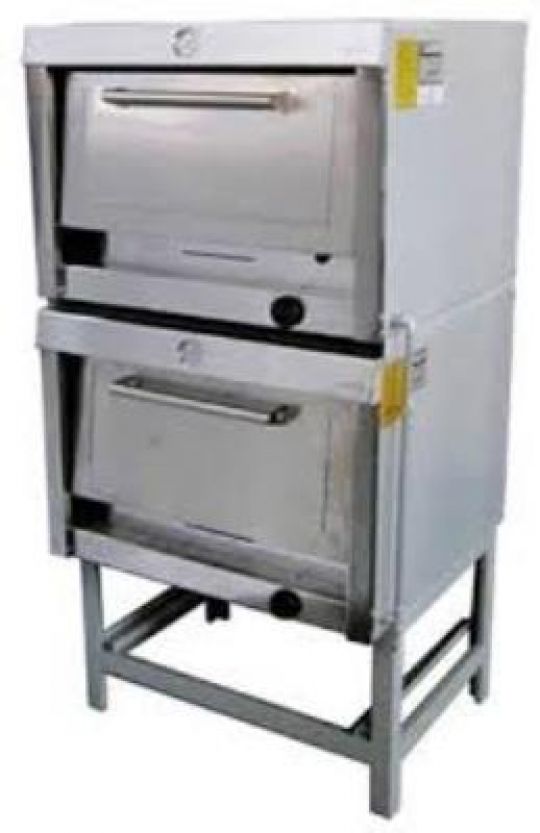 Horno Distribuidor 2 cámaras a Gas Licuado  Construido en un conjunto de acero esmaltado al horno y molduras de acero inoxidable. Cámaras con termómetros construidos en acero enlozado. Quemadores industriales de fierro tubular, comandados por llaves de 3 posiciones con dispositivo de seguridad. Incluye 2 bandejas de acero enlozado por cámara de 650 x 580 mm. Atril fabricado en acero esmaltado al horno. Tamaño de la cámara: 670 x 600 x 280 mm. Consumo térmico nominal: 19 Kw. Consumo térmico GLP: 1.390 Kg/Hr.